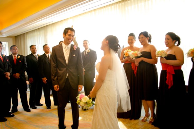 I LOVED Jenn’s dress! Can you tell? I must’ve taken fifty shots of it! It was so detailed in it’s lacey exterior, yet the silhouette was so simple and so fitting the bride. Jenn is such a sweet girl and her smile just radiates warmth. She barely spoke as she was getting ready, just laughing with the girls and waiting ernestly. She and Jesus decided to do a “first look” witnessed by all their bridesmaids and groomsmen. Like every moment of a wedding day, we photographers had one chance to capture this moment and I couldn’t begin to explain how nervous I was. But after the count of three, Jenn and Jesus turned to around to face each other and suddenly, it wasn’t so nervewracking. Maybe because they were all smiles after. =)