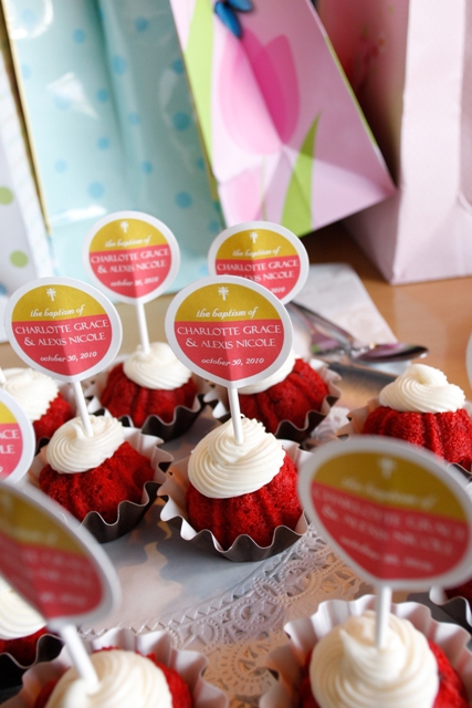 [(Honorable mention: Nothing Bundt Cakes made these delicious bundtinis, and Iya made those cute tag stands to commemorate Charlie and Alex’s special day. We put those tags together the night before. Good stuff, huh? =)]