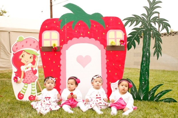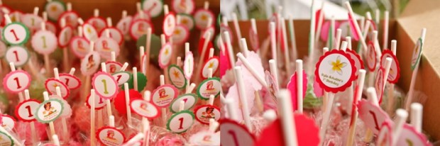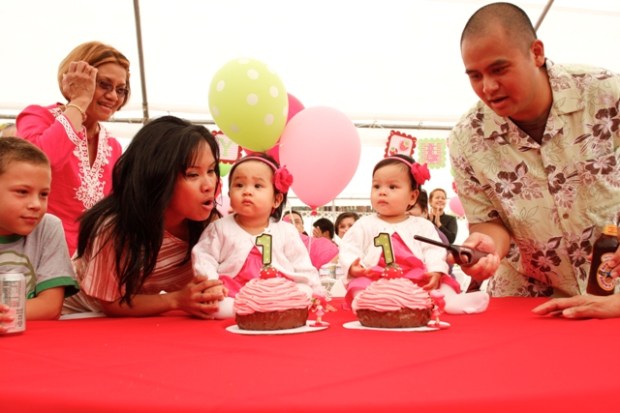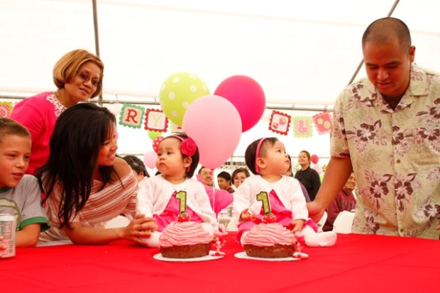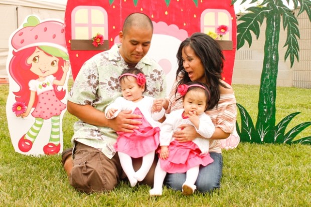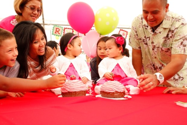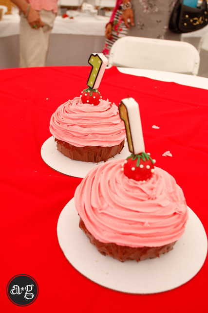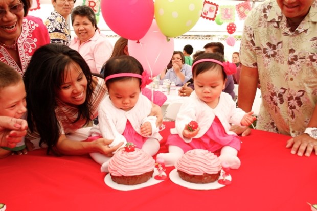 Good friends with the Lapaz gals, the Cortes twins celebrated their 1st birthday shortly after their buddies, Charlie and Alex =) In a sea of red, pink and green, Strawberry Shortcake and friends reigned supreme. 200+ cakepops, some of which resembled strawberries, a Strawberry Shortcake moonbounce, a Strawberry Shortcake background for pictures (which they made), a strawberry pinata and the creme de la creme, two sweet little girls surrounded by parents and grandparents who adore them, a family who loves them, and friends (adult and kids alike) who could spend hours at playtime with them. How much more blessed could two little girls be?