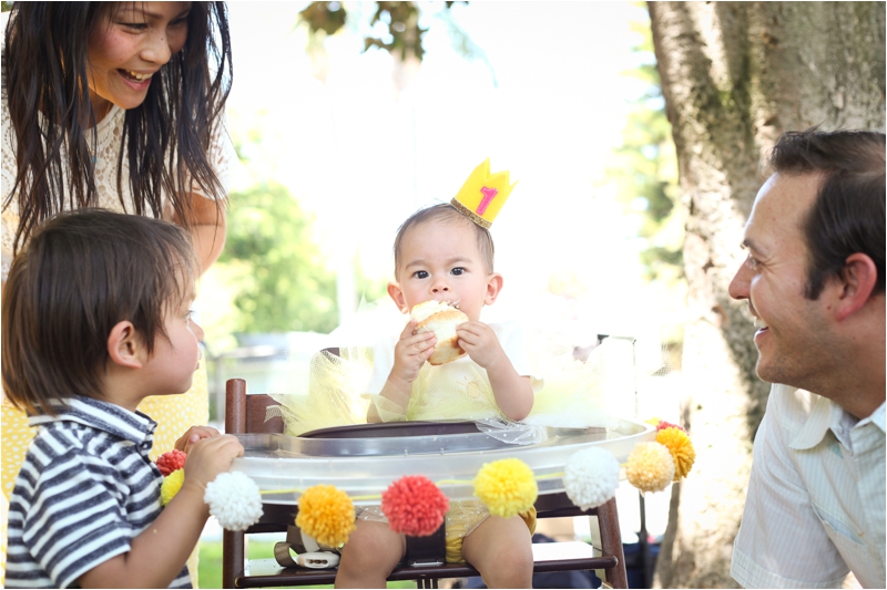 Sunshine – what a wonderfully bright and cheery theme for a 1st birthday! But aside from the sunny details of the day (that garland was handmade by mom, one pom-pom at a time), what struck me most was the light that little Sophie provides for her family. She’s an observant little ball of curiosity and sweetness, just like one-year old girls should be.